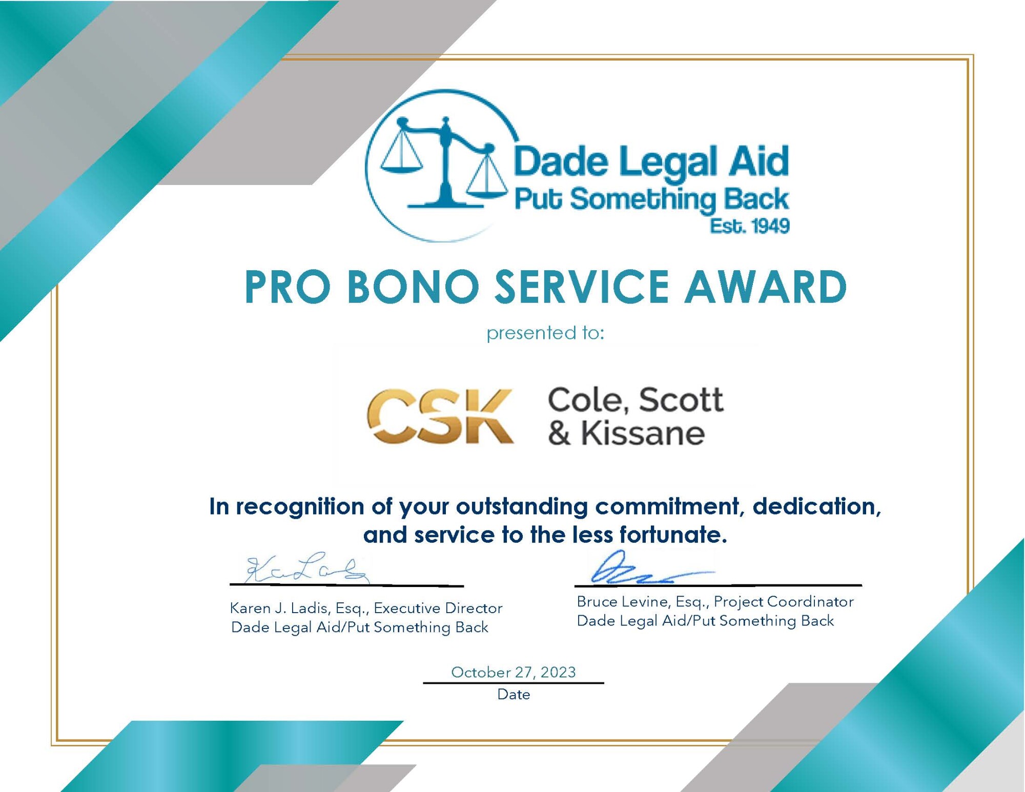 In 2023, we were recognized by Dade Legal Aid's Put Something Back Pro Bono Project.