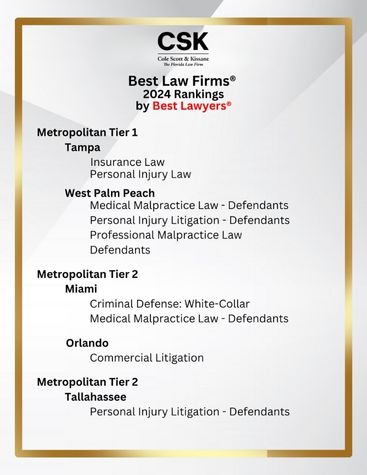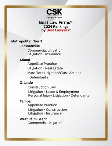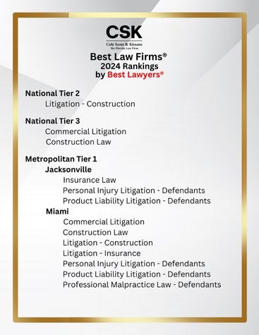 Cole, Scott & Kissane is pleased to announce that we have been ranked in the 2024 Best Lawyers® “Best Law Firms® ” list nationally in three practice areas, and regionally in 31 practice areas across our 13 offices. Below is a comprehensive list of all of our rankings by tier and office.