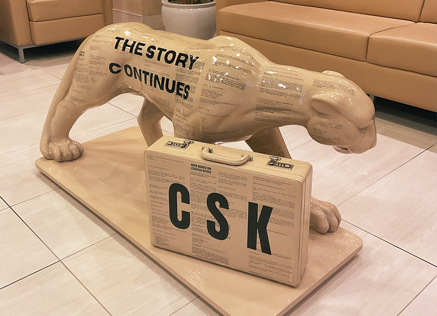 Wrapped in newspaper print chronicling CSK’s milestones since its founding in 1997, Lexi the Defender transforms corporate history into a living narrative. The Panther’s poised stance, briefcase in hand, and the phrase “The Story Continues” etched into its design, symbolize agility, professionalism, and the firm’s forward momentum.